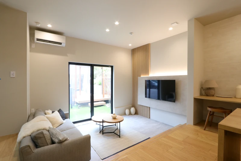 木目と柔らかな色合い、ダウンフロアが生む上質なリビング空間。