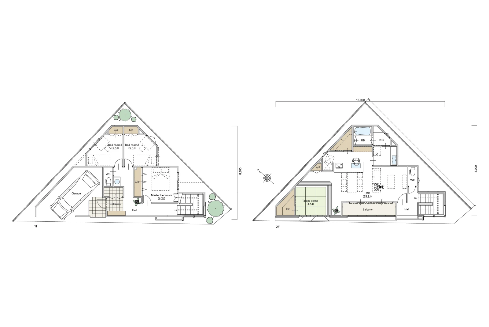 三角形の変形地に建つ家。土地の形の不便さを感じさせない間取り。
