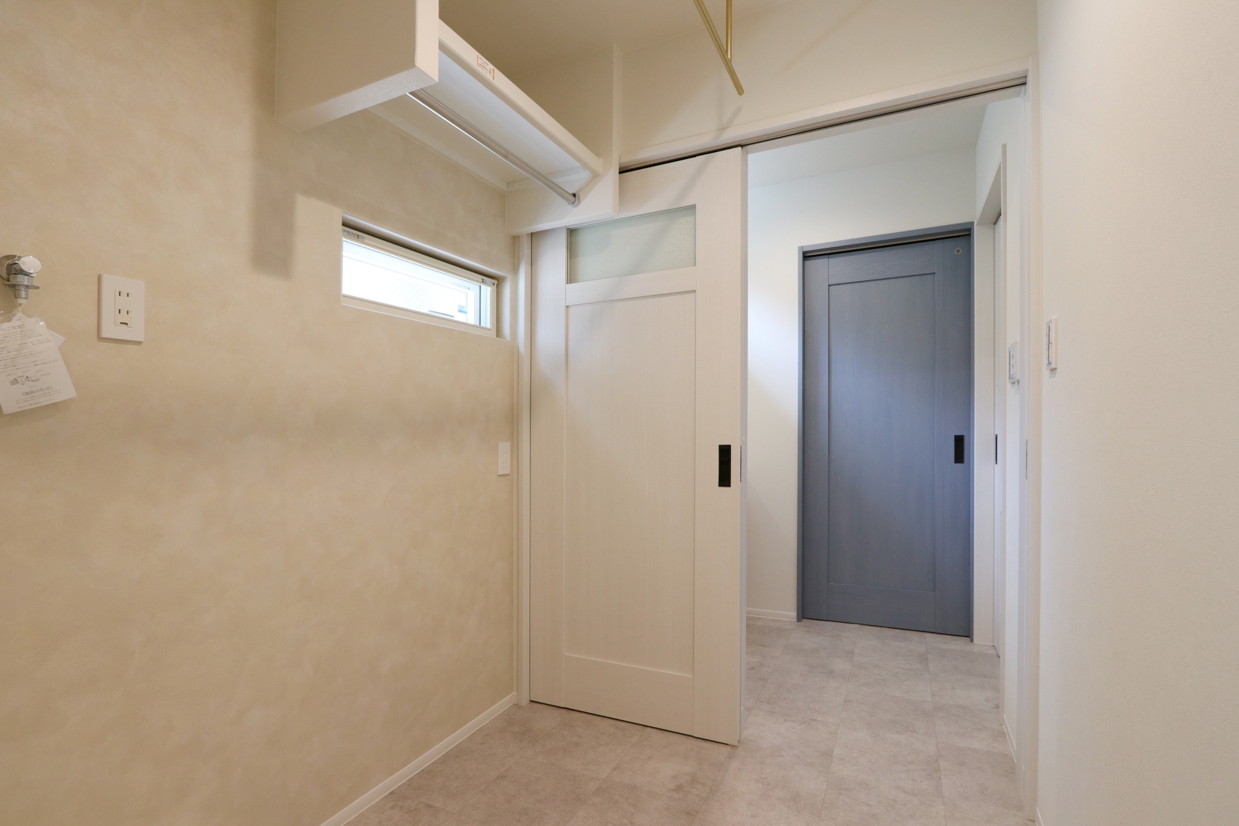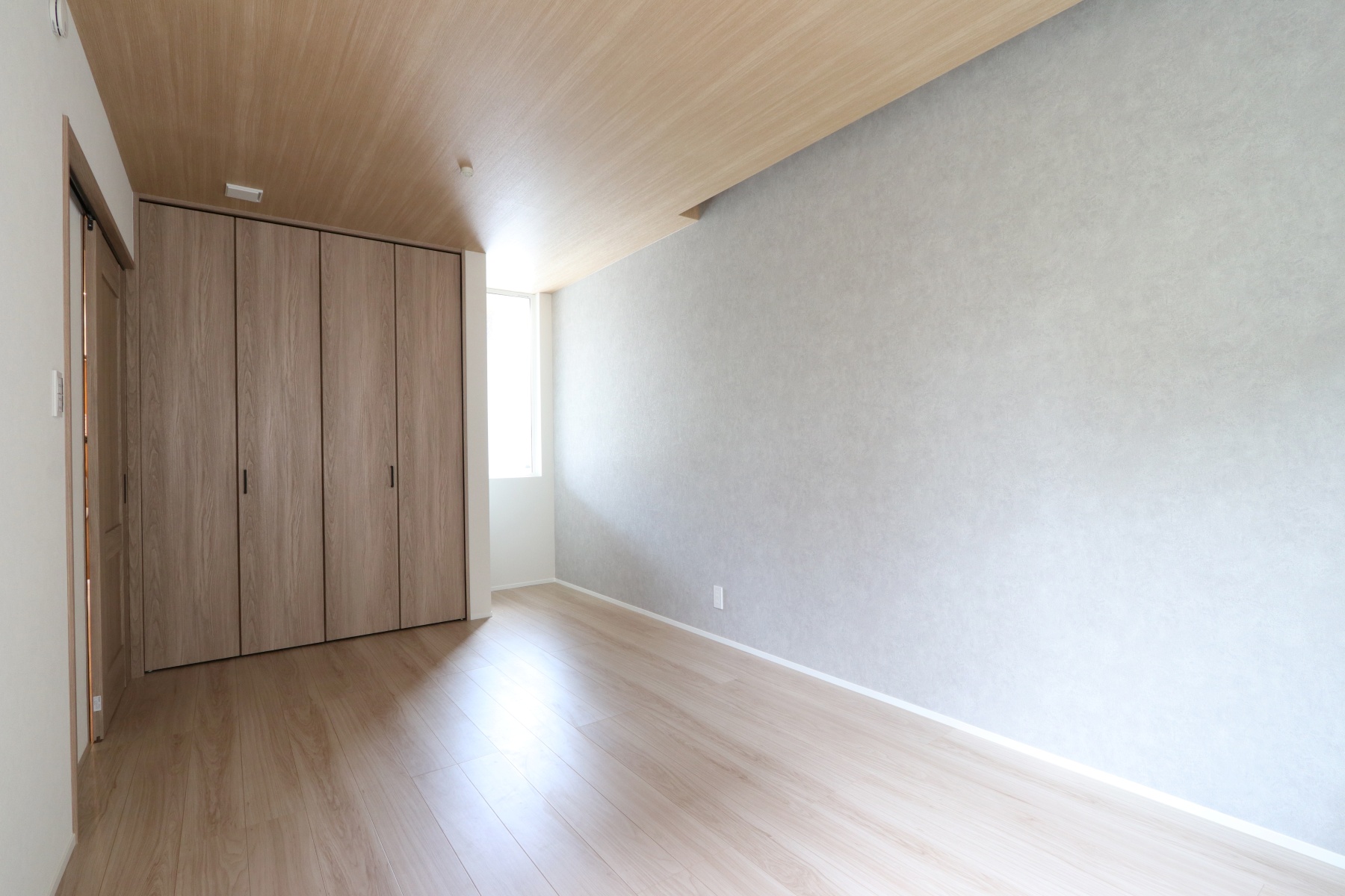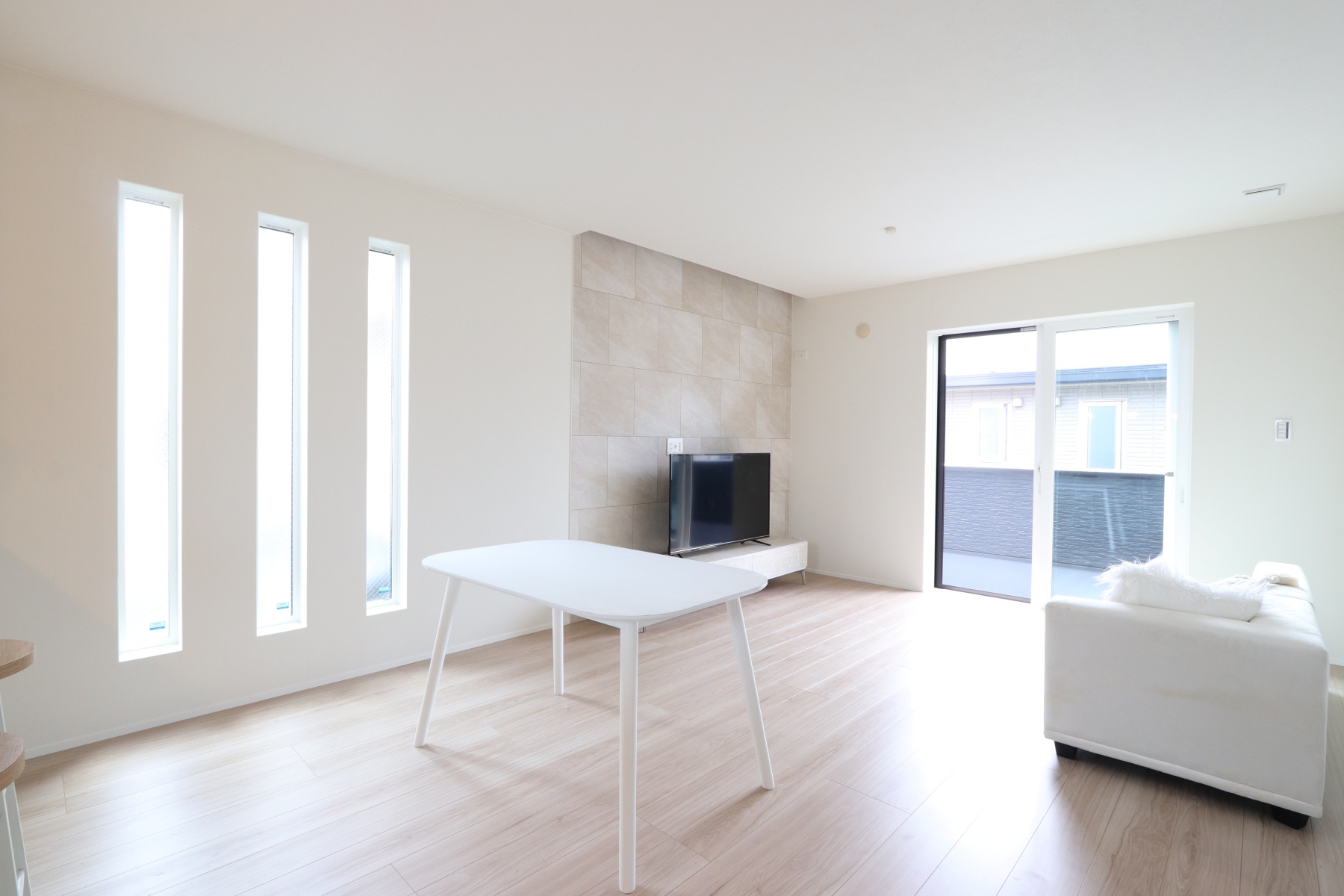 外観は濃淡のグレーに木調の玄関ドアが映え、落ち着きの中に温かさを演出。室内は淡い木目フローリングで明るく広がりを感じられる空間です。壁面のエコカラットが上質感を高め、三連のFIXがやさしい光を取り込みます。