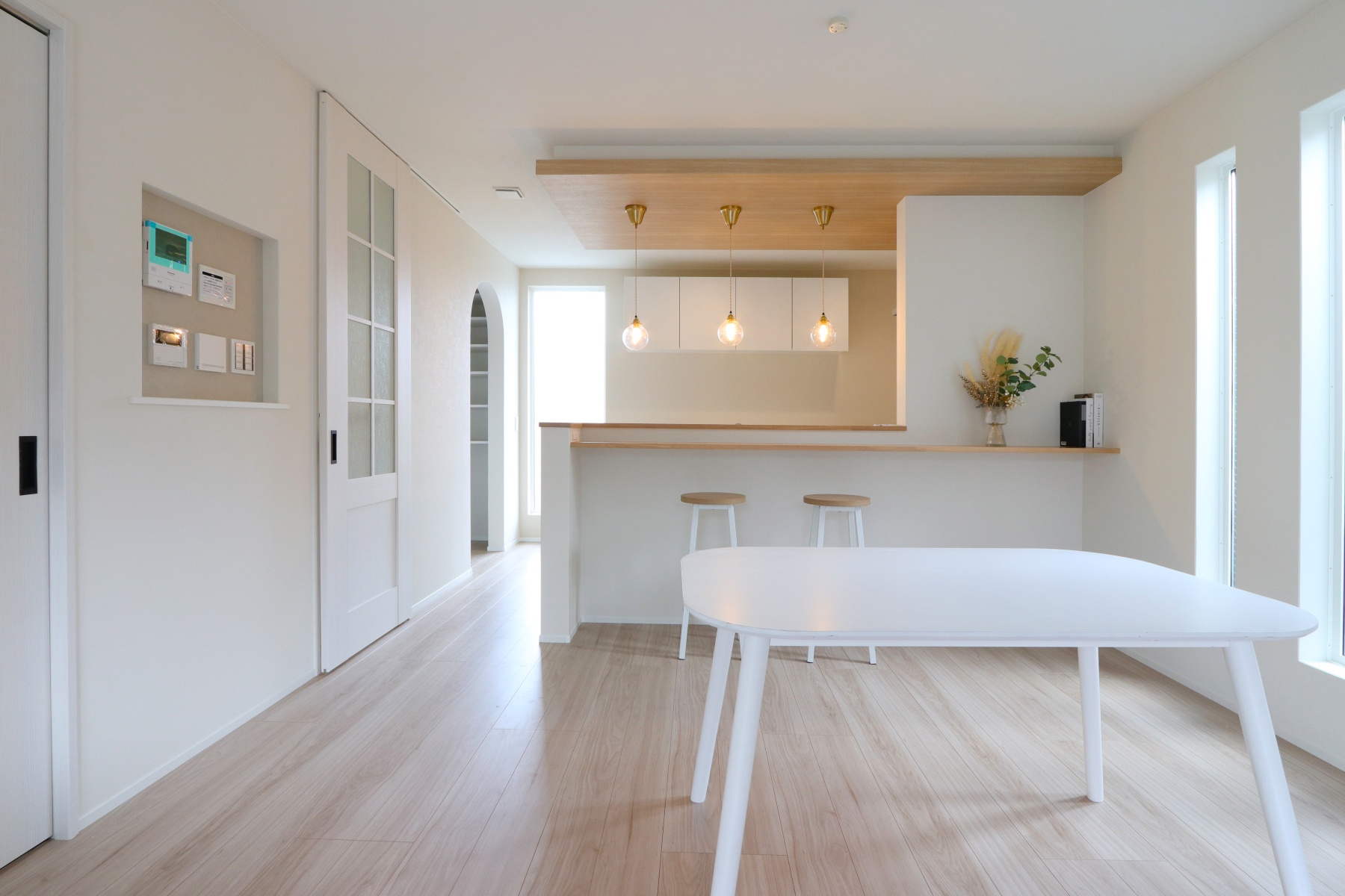 白と淡い木目が広がる、光と自然を感じる心地よい空間。