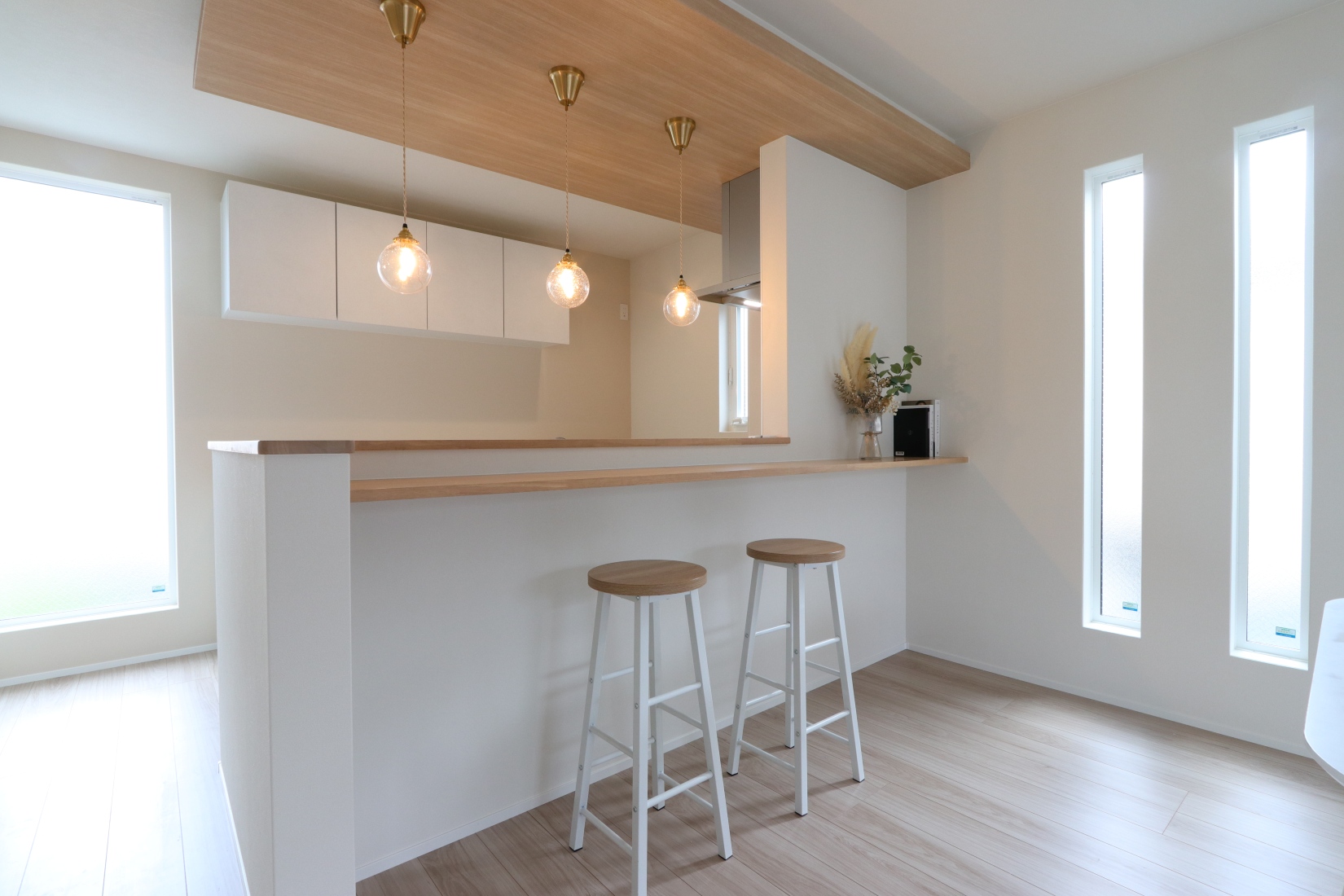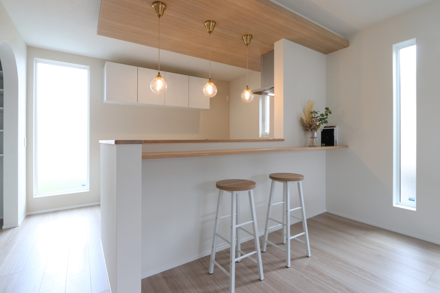 キッチン上部の折り下げ天井やカウンターの木目がアクセントとなっています。