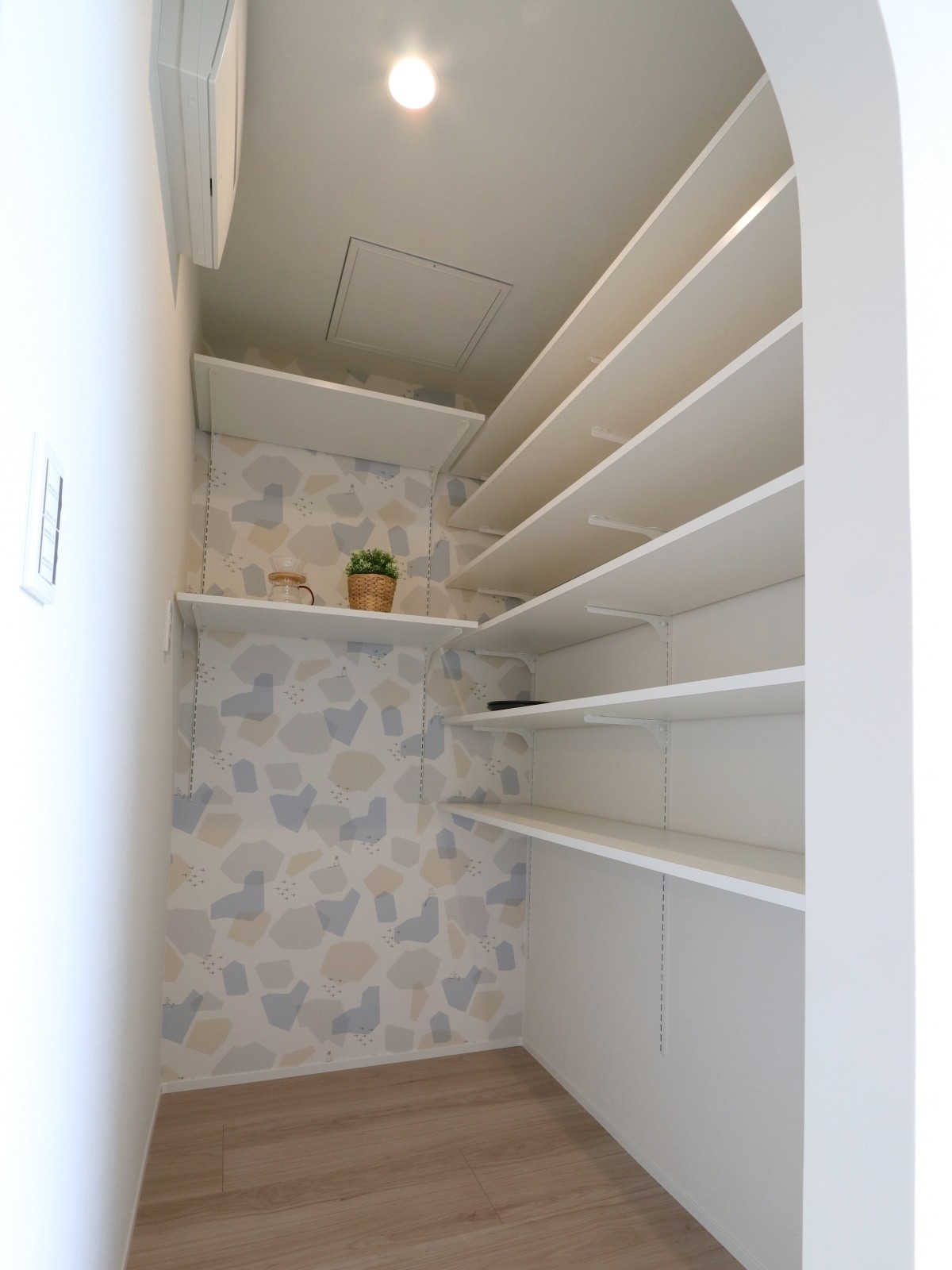 たっぷりの食料品、食器などを収納できます。アーチ開口で可愛らしさもプラス。
