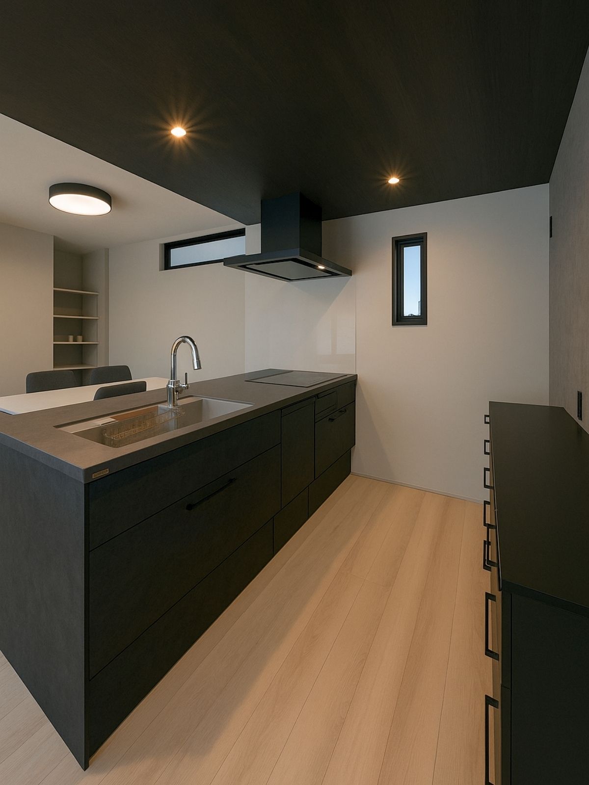 黒とグレーが織りなす静かなトーンに、自然光がやさしく差し込む。