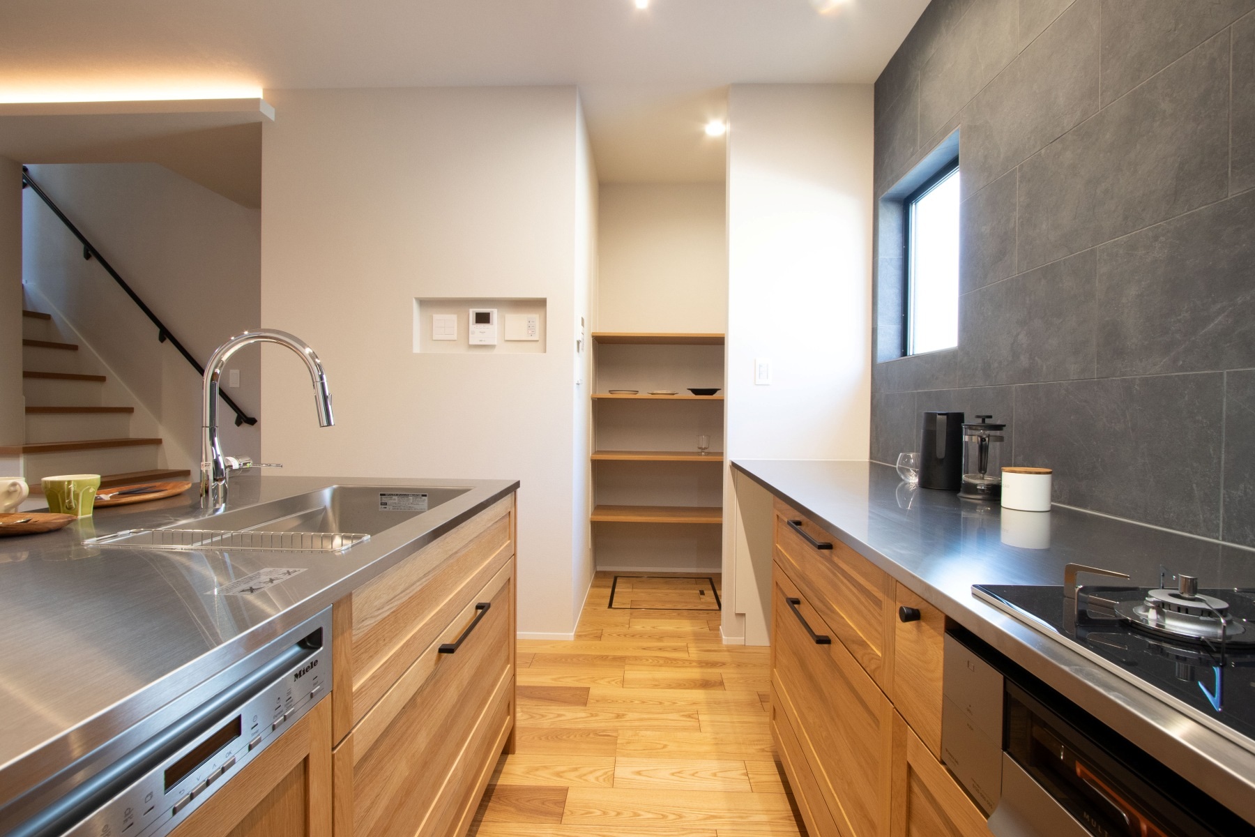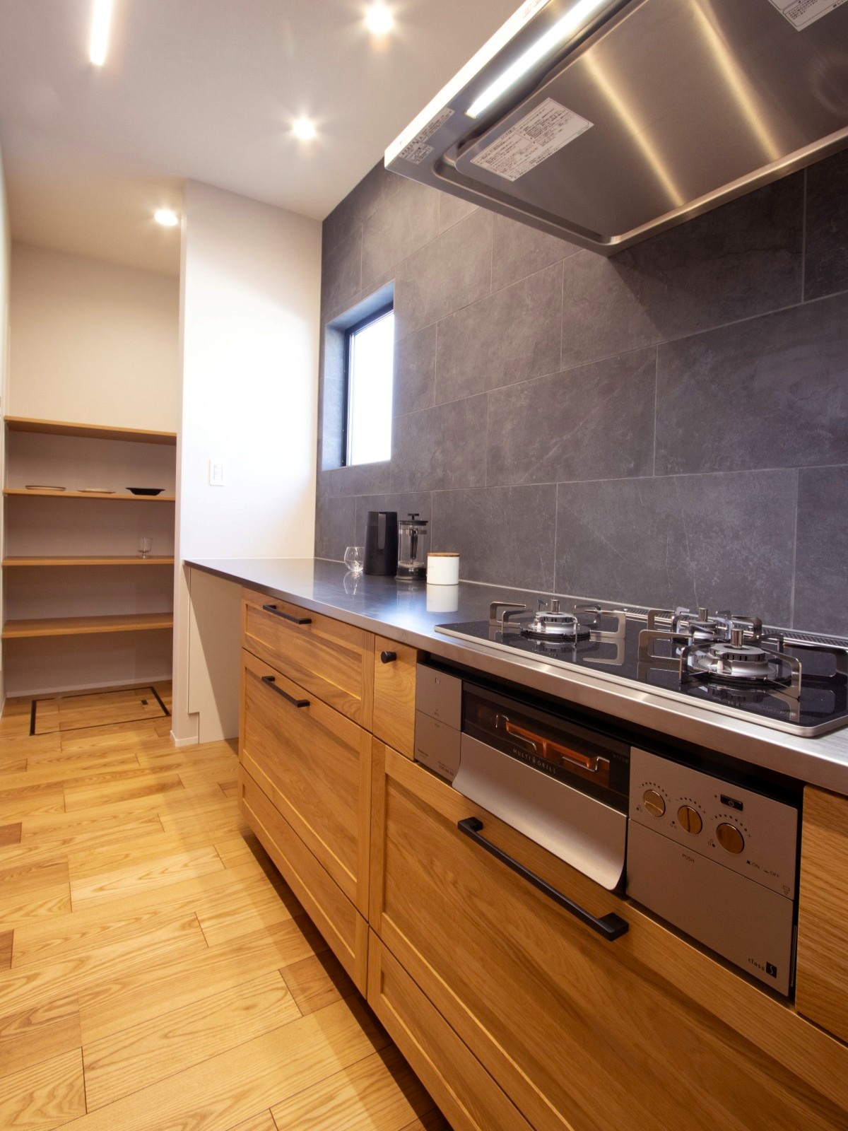木目パネルとステンレスの天板が使い込むほどに味が出るシステムキッチン。