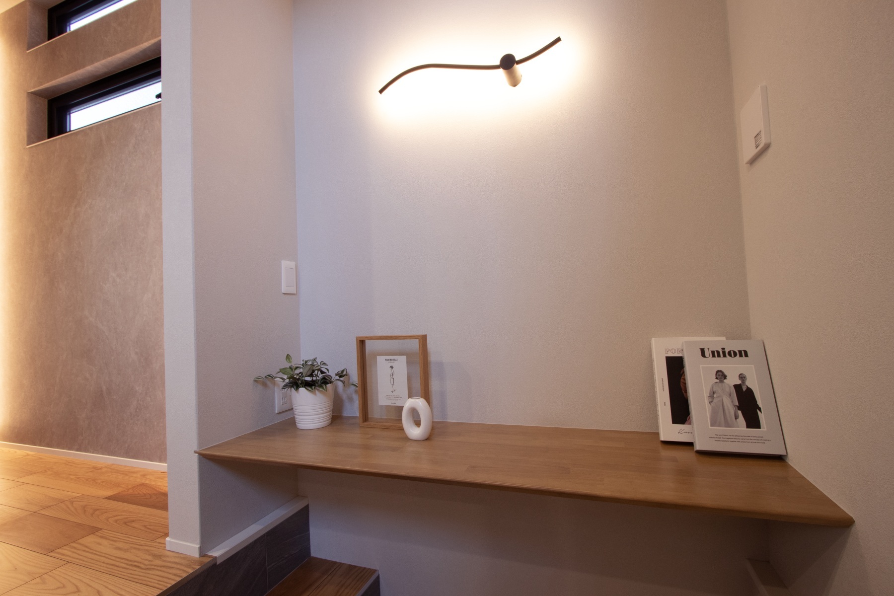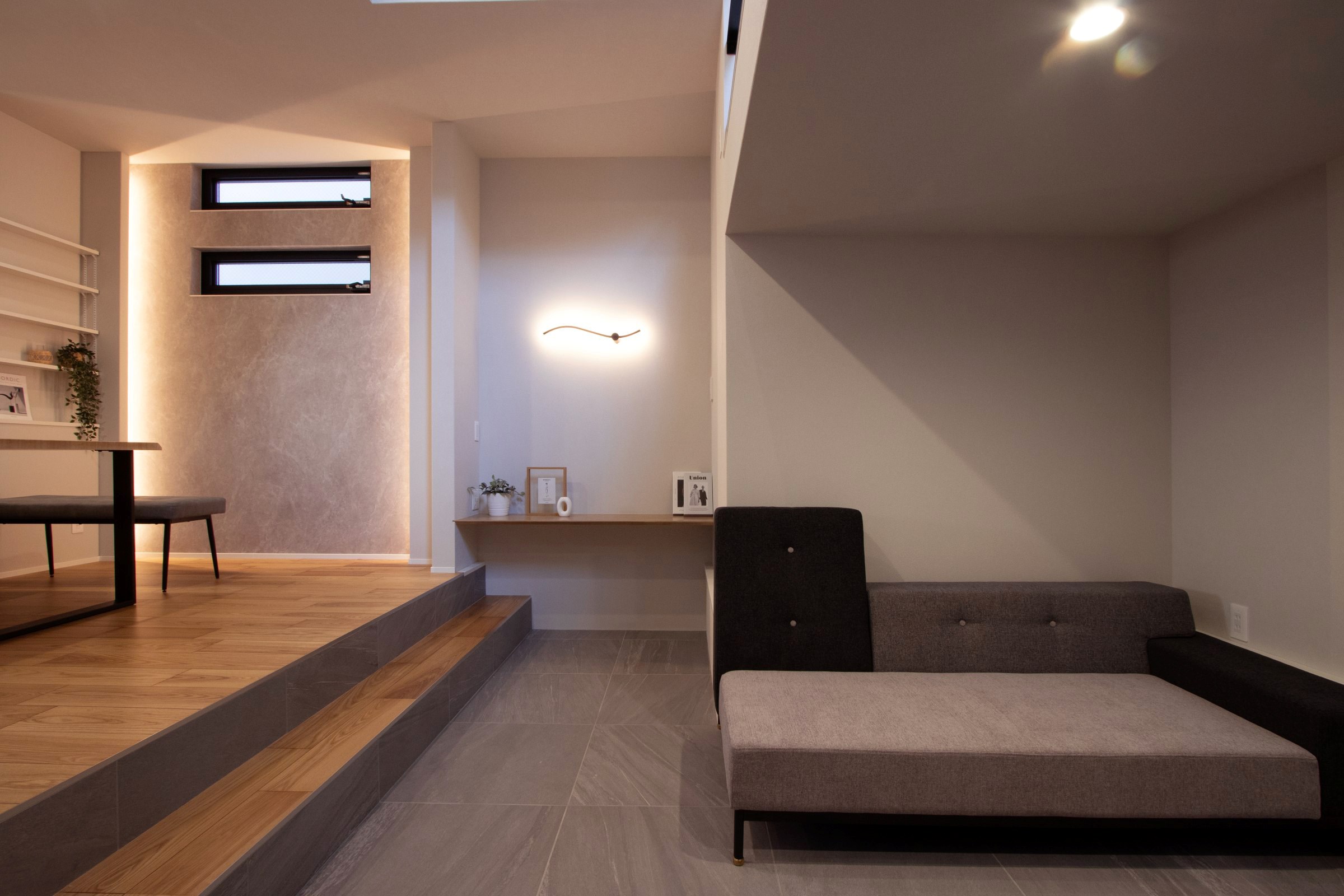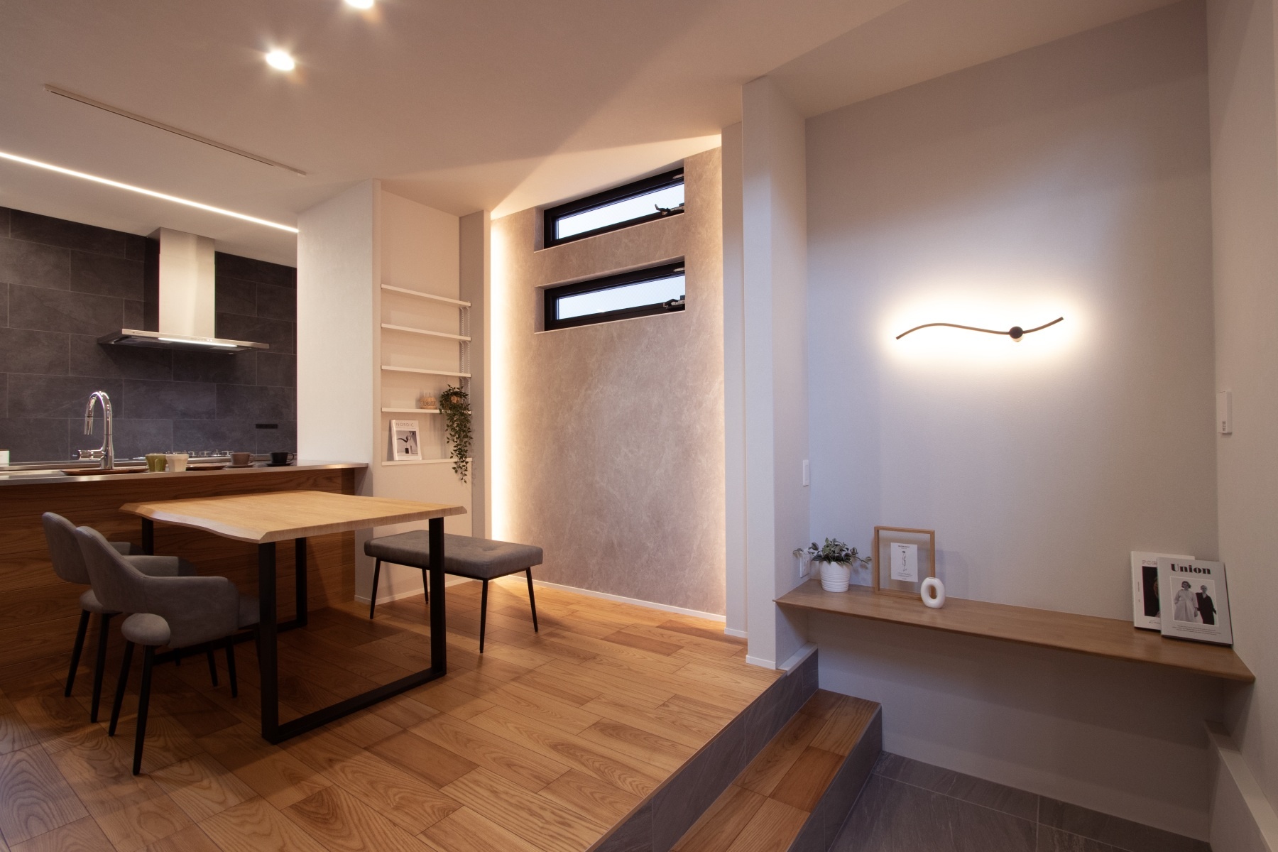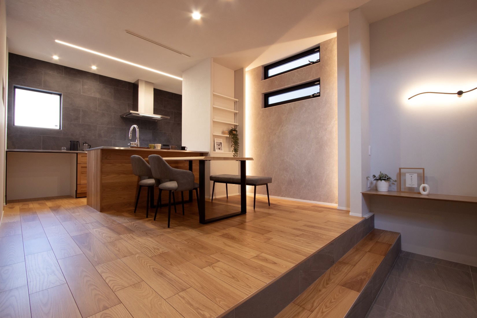 木目の美しさが際立つ床材と、グレーで貼り分けたクロスがつくる落ち着きあるモダン空間。随所に配したLED間接照明が、住まいに上質な陰影と奥行きをもたらします。ダイニングキッチンから二段下がったリビングは、上部の大開口吹抜けにより圧倒的な開放感。2階の多目的スペースが家族の時間を緩やかにつなぎます。