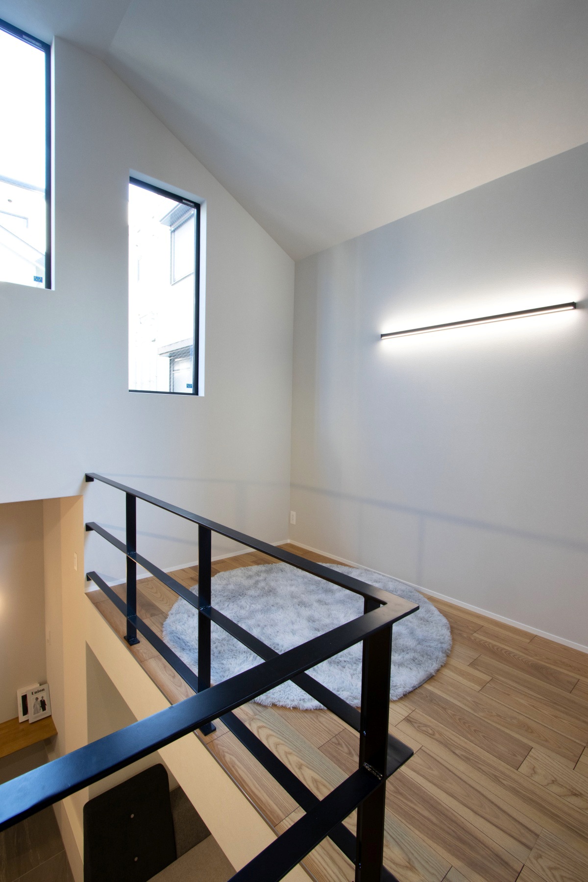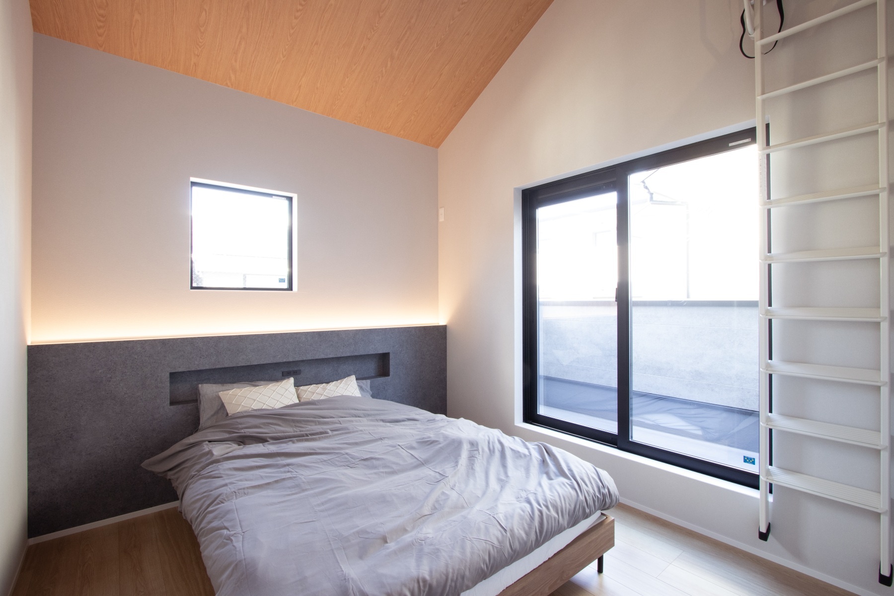 屋根裏スペースまで使った勾配天井でさらにモダンさを演出。
