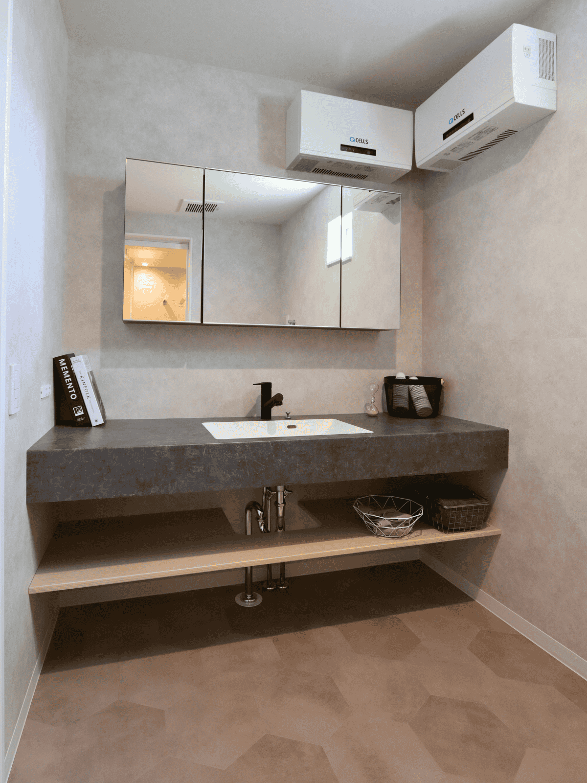 収納スペースのある三面鏡にワイドなカウンターを組み合わせた上質な洗面ルーム。