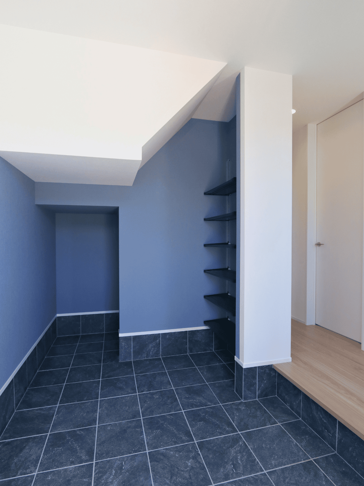 落ち着いた色合いのタイルを敷きつめた玄関土間。