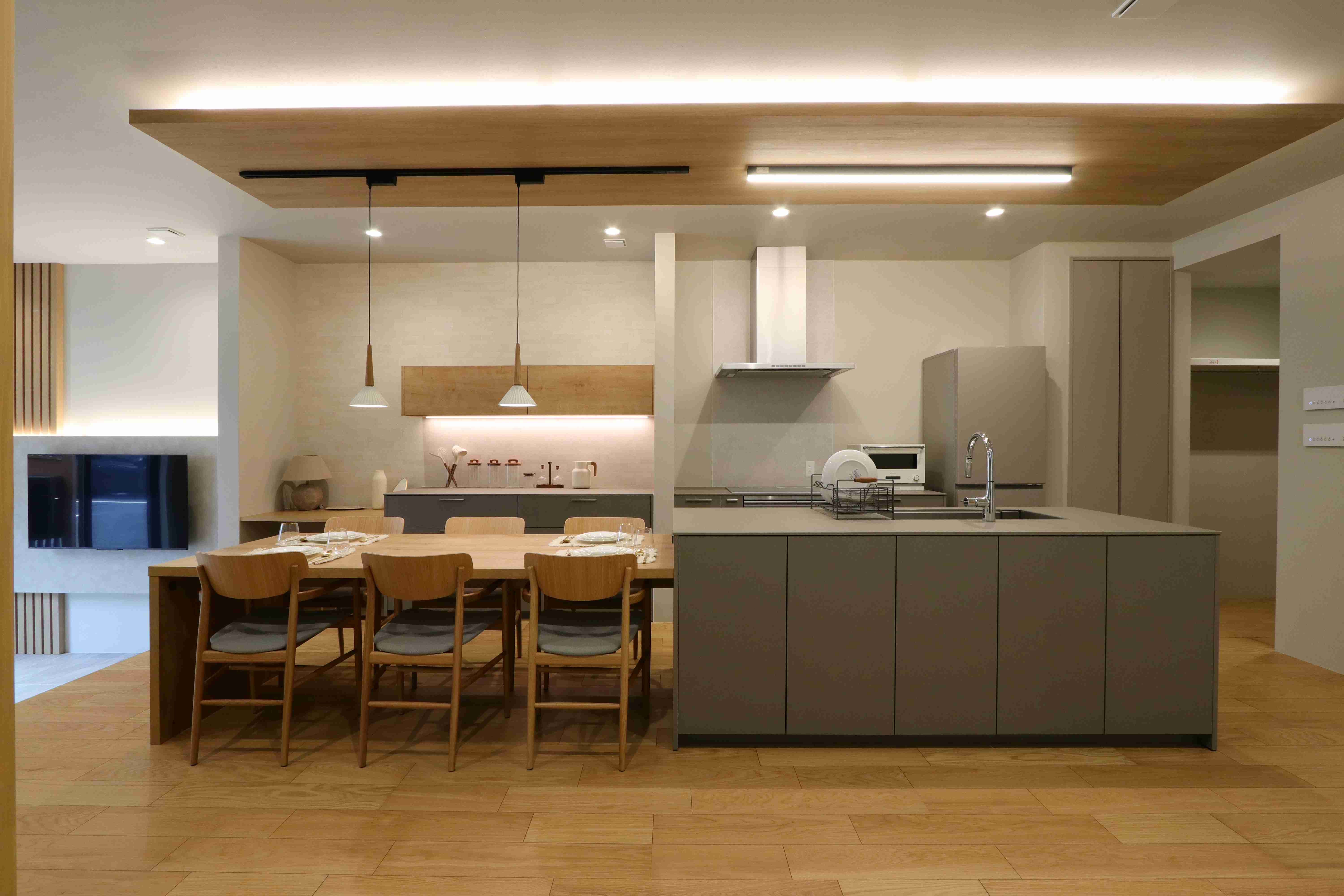 キッチンは、折下げ天井に間接照明を入れ、高級を演出しています。毎日使用する空間、日常を特別に感じることができる場所です。