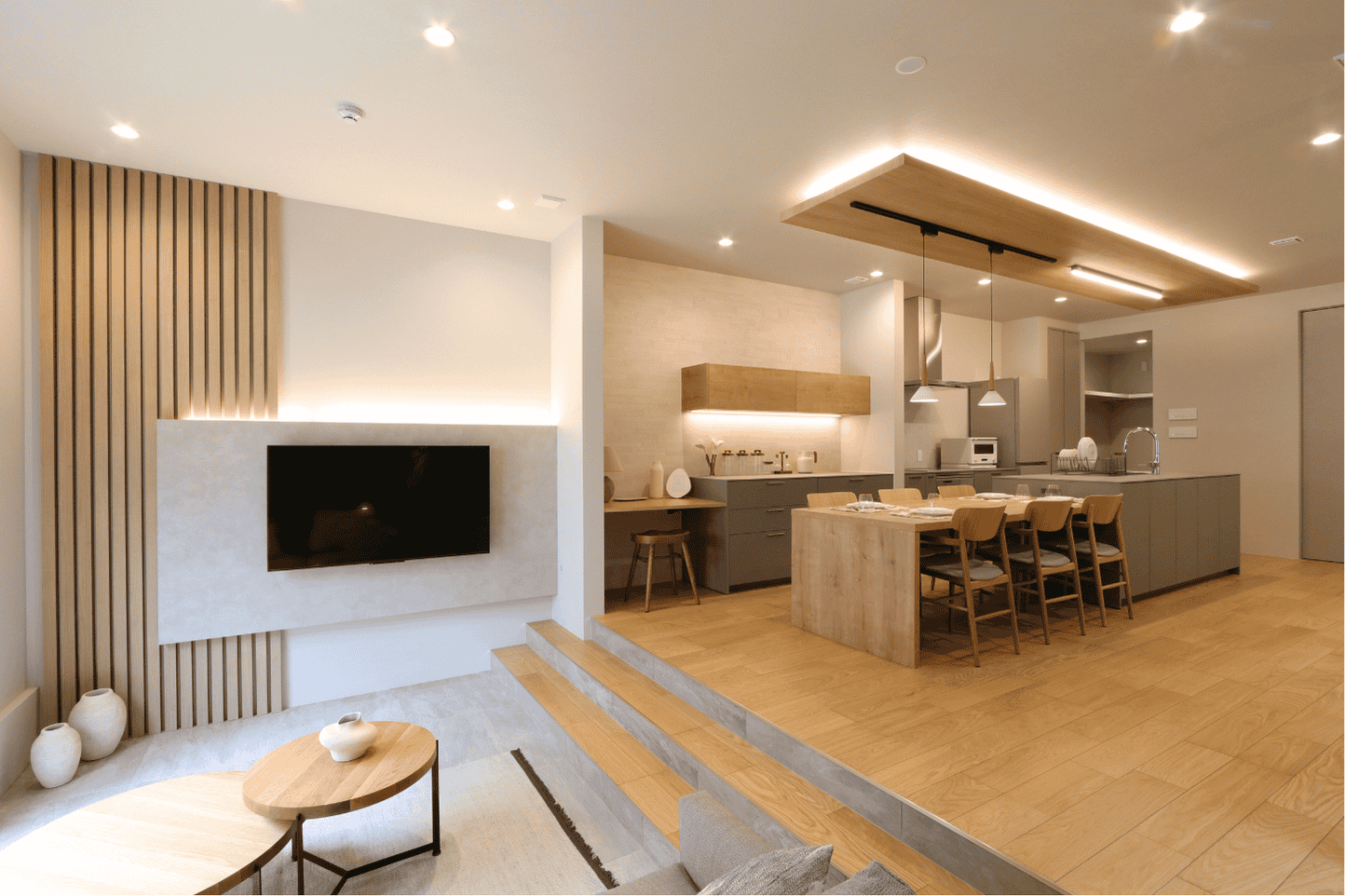 リビングは壁を使用せず、段差をつけて空間を区切り、開放感と両立させることができています。
