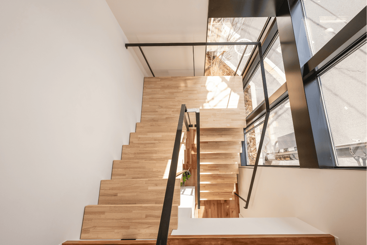 1階と2階を繋ぐオープン階段には、陽の光が入りあたたかく心地のいい場所。