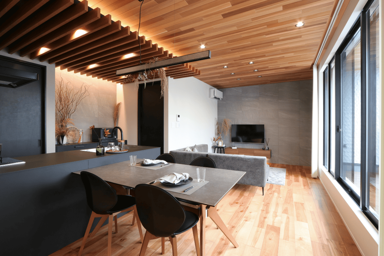 優しい木目で統一した落ち着きのあるLDK。大きな窓から光が差し込み、和室とのつながりで奥行きを感じる開放的な空間に仕上げました。家族が自然と集まる、心地よいリビングです。