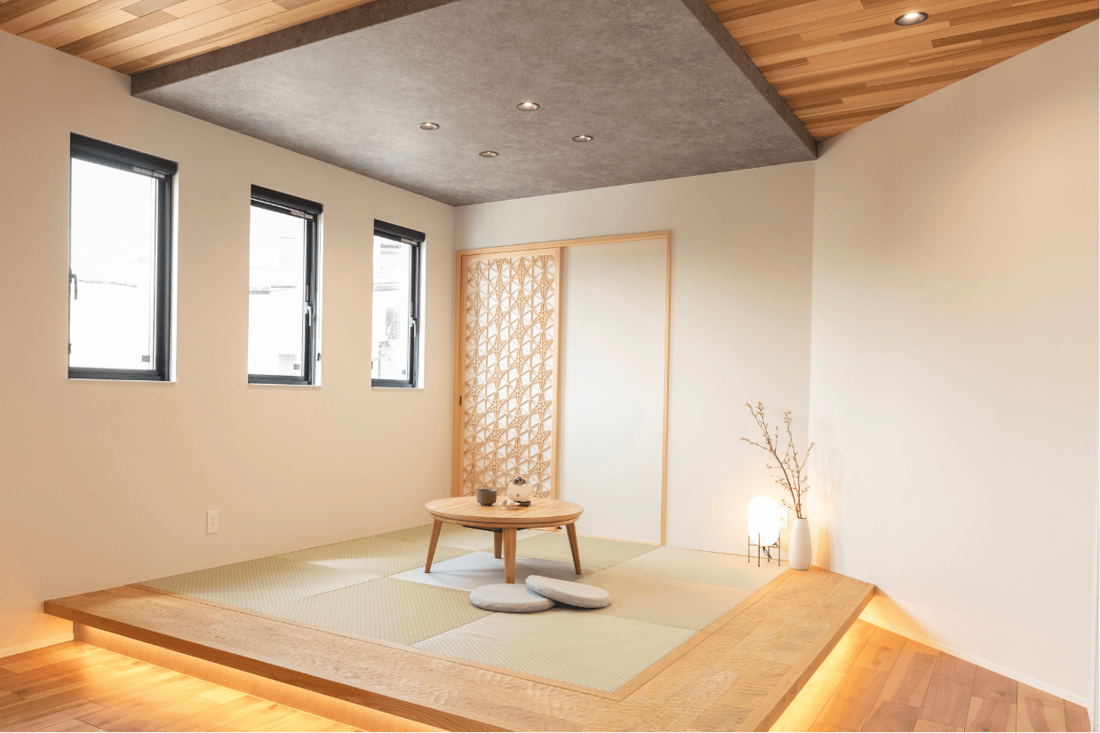 折下げ天井と小上がりの和室。小上がりで壁を使用せず空間を区切っています。奥には収納もあり、実用性も高い空間です。