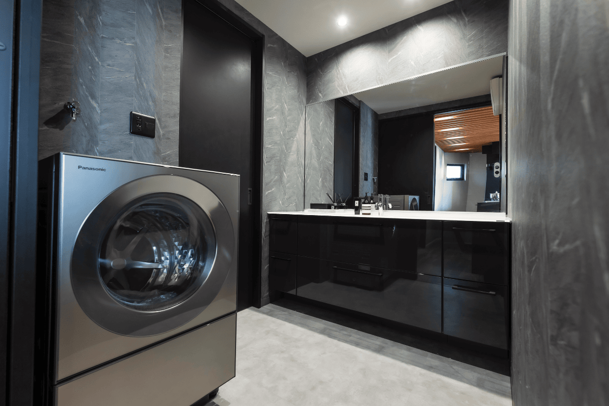 2人で同時に使用できる広さをとっています。シックなブラックでまとめ、まるでホテルのような洗面脱衣室です。