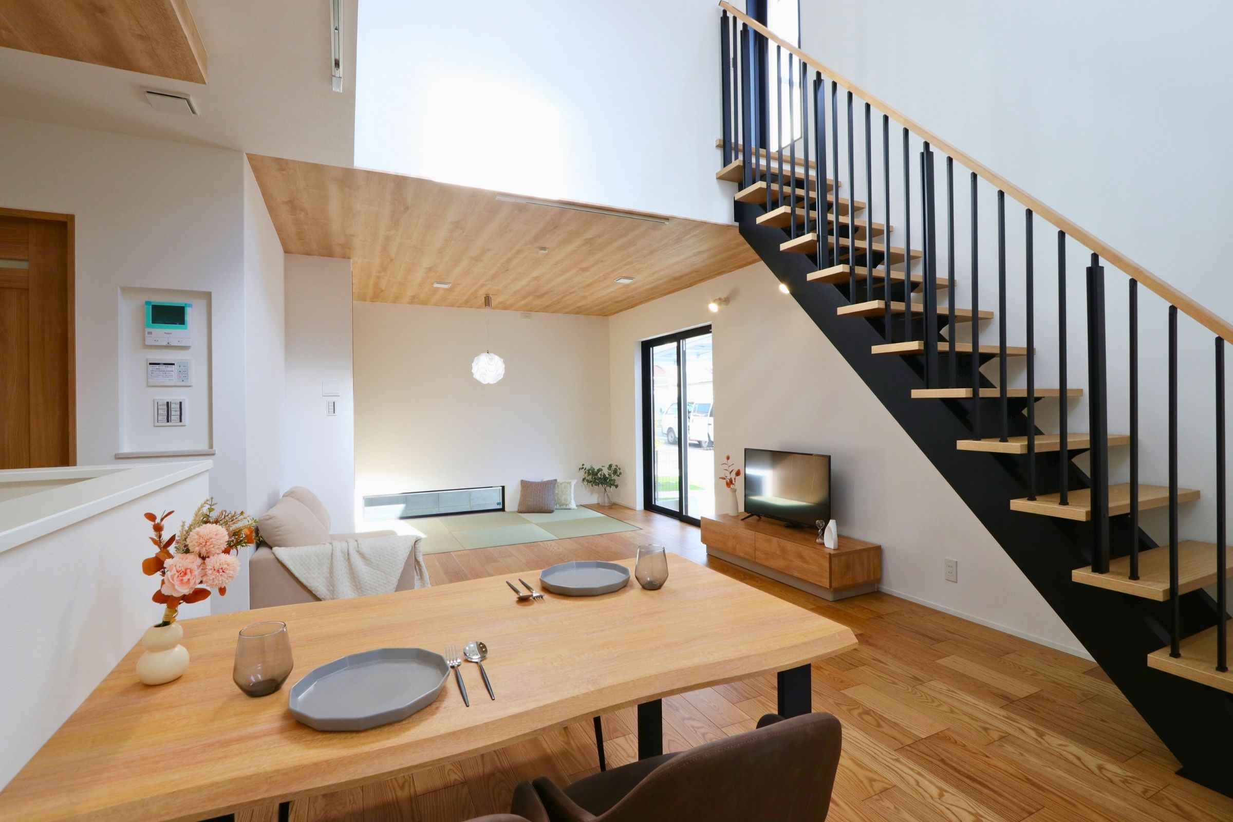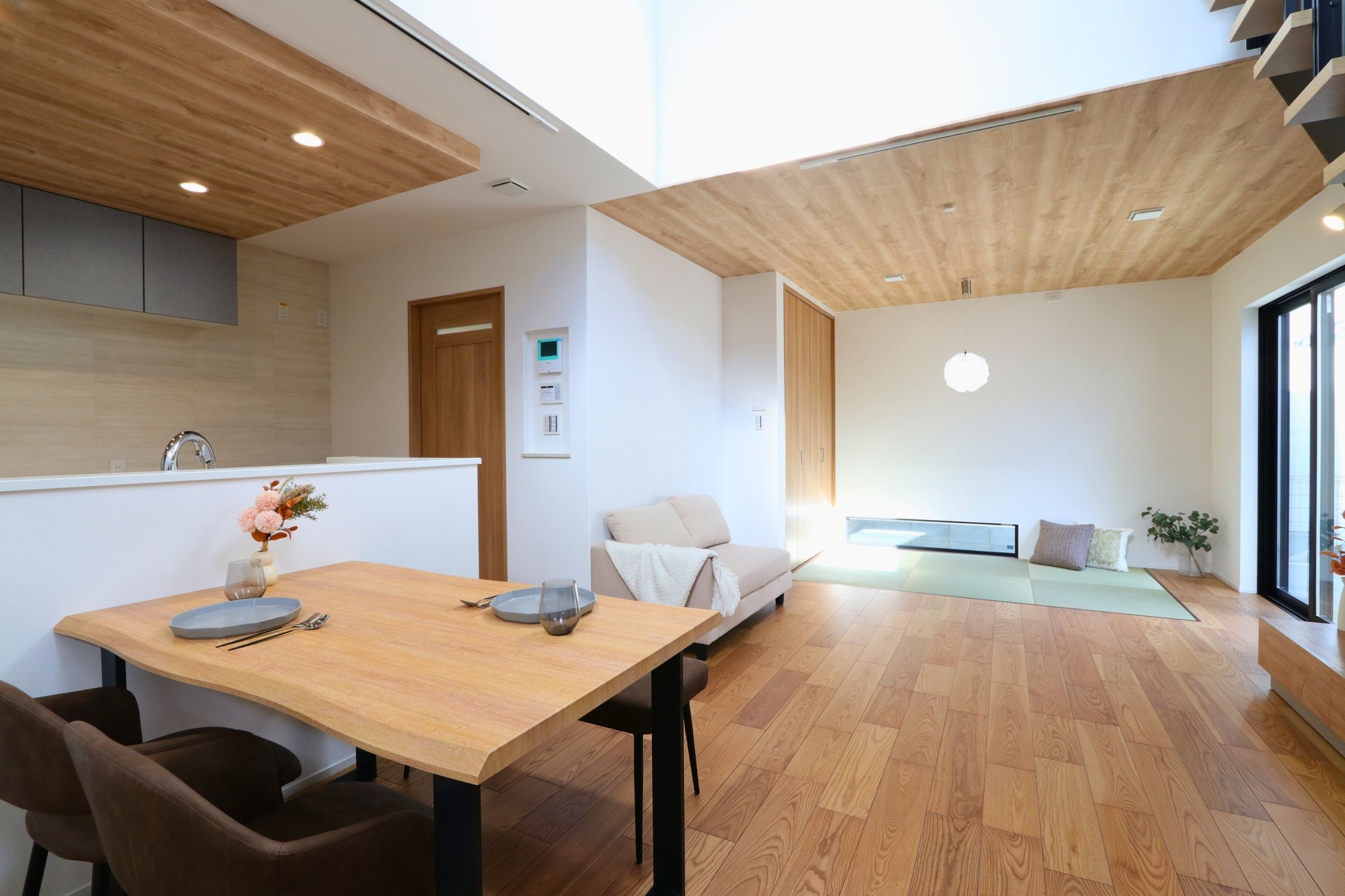 吹き抜けダイニング・広いバルコニー・車が2台置ける・広い風呂・広いキッチン