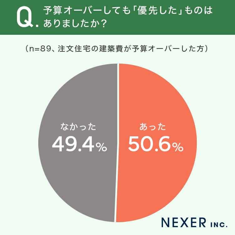 結果として、約半数が「優先したものがあった」と回答しました。予算を超えることを承知のうえで、どうしても実現したい「譲れないこだわり」を重視した方が多いことが分かります。