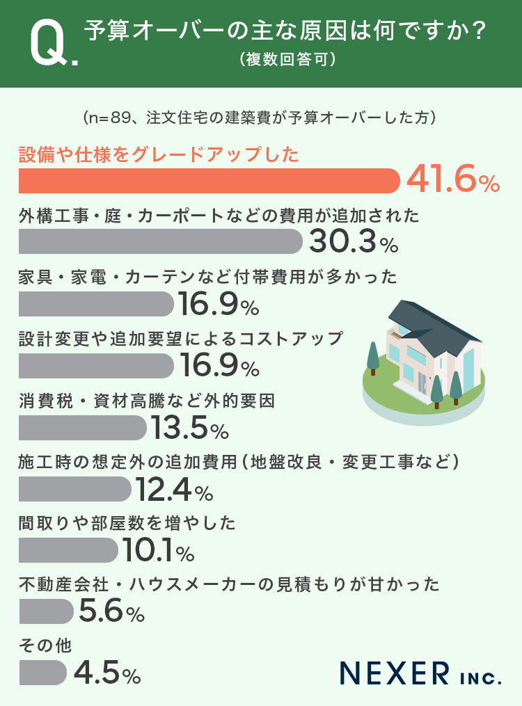 追加費用を許容してでも理想を叶えようとする姿勢から、施主の強い意志が感じられます。予算オーバーは必ずしも失敗ではなく、納得感や満足度を高めるための前向きな選択だったという実態が見えてきます。