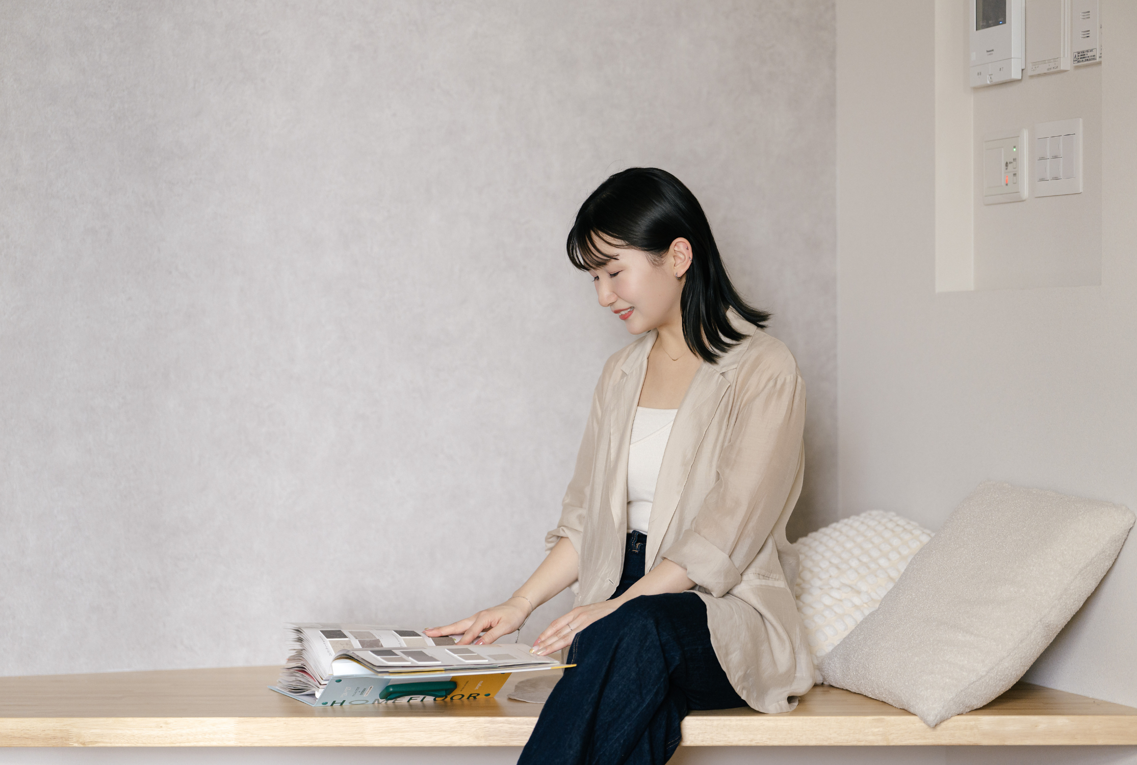 インテリアコーディネーターとして、お客様と打ち合わせし内装・外装を決めたり、パース作成を行ったりしています。また、支店やモデルハウスの展示コーディネートも担当し、その都度ショールームで素材や家具を確認します。本社での業務が中心(8割)ですが、現場での体験を通してお客様の理想の住まいを形にするやりがいがあります。